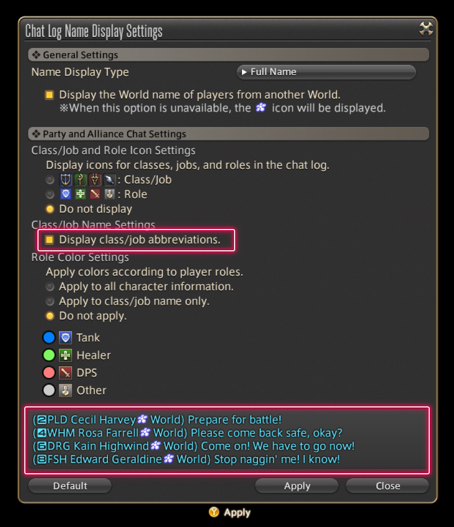 Abbreviated class and job names can be enabled in the chat log for party or alliance members. From the main menu, select System and open the Character Configuration menu, then select the Log Window Settings tab from the column on the left. Under General, select Name Display Settings and check the "Display class/job abbreviations" box.