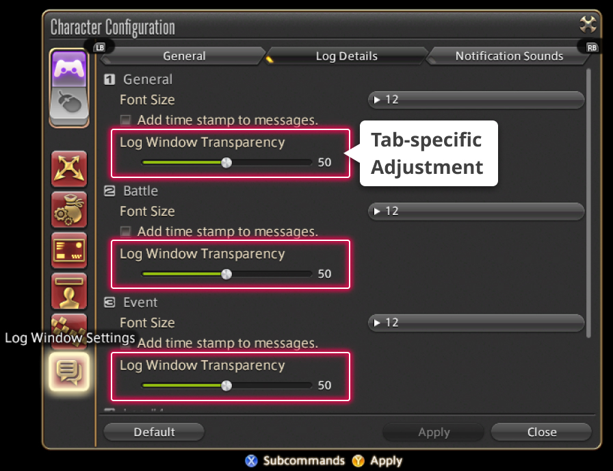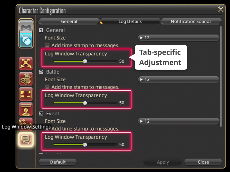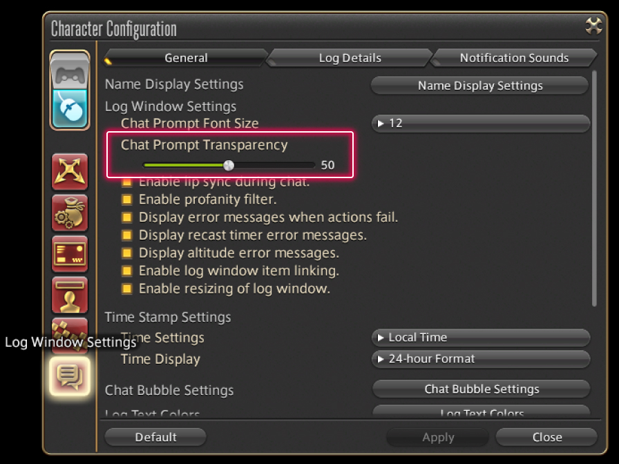 From the main menu, select System and open the Character Configuration menu, then select the Log Window Settings tab from the column on the left. Under Log Details, adjust the Log Window Transparency slider to your desired level. Transparency can be adjusted separately for different log window tabs.