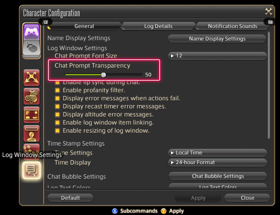 From the main menu, select System and open the Character Configuration menu, then select the Log Window Settings tab from the column on the left. Under General, adjust the Chat Prompt Transparency slider to your desired level.