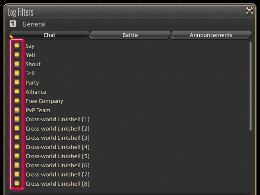 To avoid that happening, you can filter out certain types of messages via Log Filters under the General tab of Log Window Settings in the Character Configuration menu. Select the tab you wish to edit and uncheck the box for any category to hide related messages.