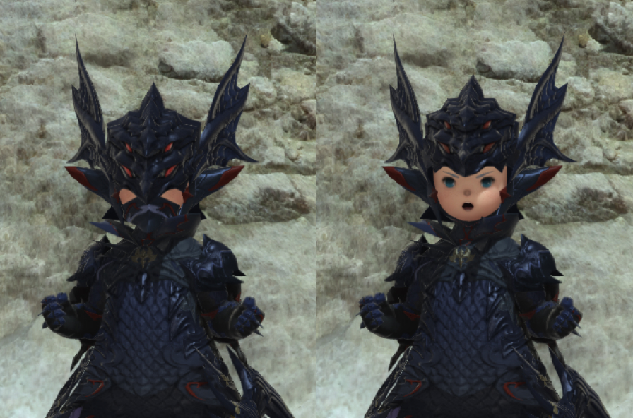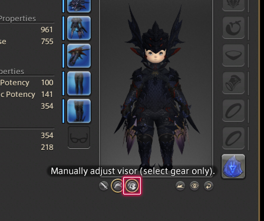From the main menu, select Character, open the Character menu, and then select the "Manually adjust visor (select gear only)" button. Toggling this function will adjust the appearance of certain headgear to reveal your character's face.
