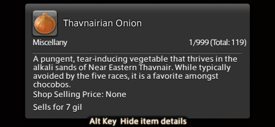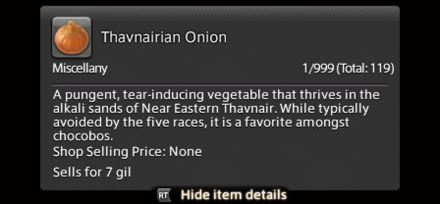 Thavnairian onions can be purchased via market boards, grown in garden patches, or received as rewards in certain quests.
