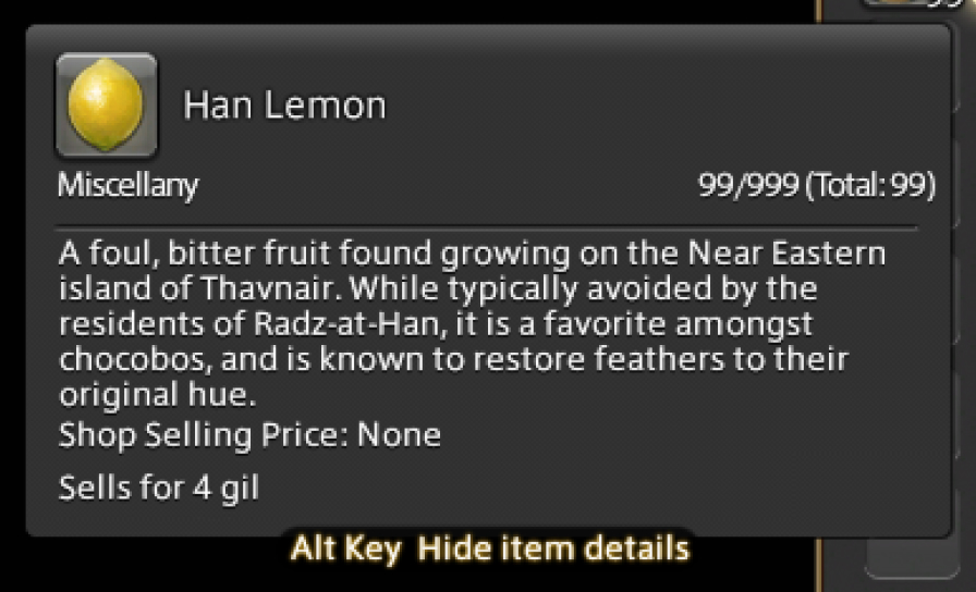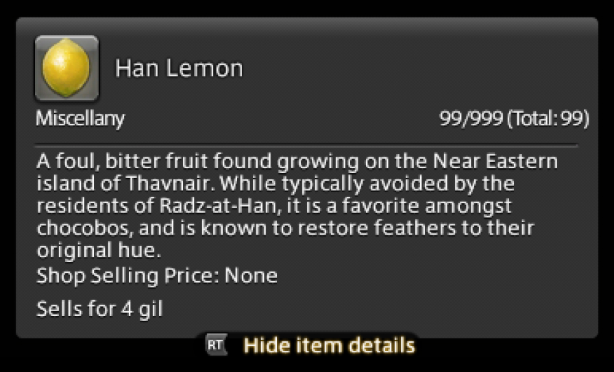 Han Lemons can be purchased from the market board, grown and harvested from seeds purchased from Hunt billmasters, or obtained upon completing the quest A Step in the Right Direction.