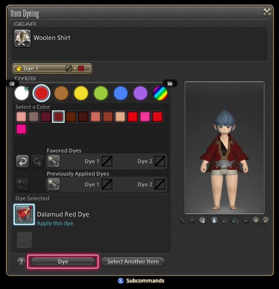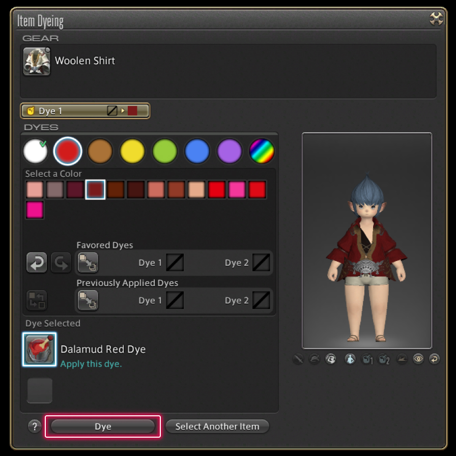 Dyes are divided into categories according to color. Once you have chosen, select Dye.