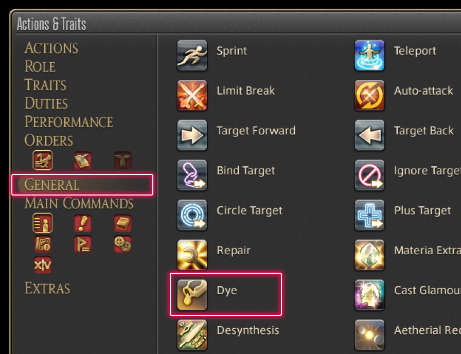 The Dye action is accessed from the Actions & Traits menu or by selecting Dye from an item's subcommands.