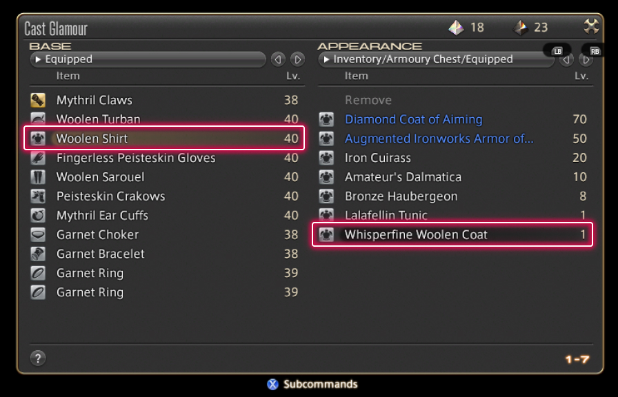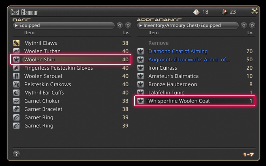 First, choose the base item, then select the glamour you wish to cast from the list of available items.