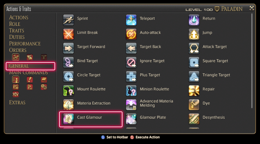 To cast a glamour, use Cast Glamour from Actions & Traits or highlight an item, press X (□ on PS5™/PS4™, X on Xbox Series X|S) to open its subcommands, then select Cast Glamour. Alternatively, you can access a glamour dresser in an inn room.