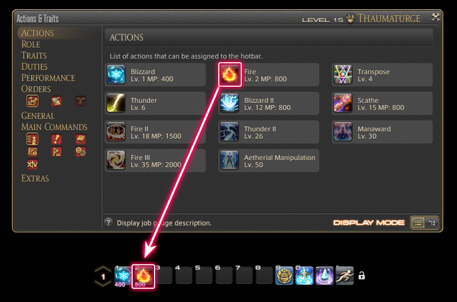 From the main menu, select Character and open the Actions & Traits menu. From the tabs on the left you can peruse several categories of actions to register to your hotbar.