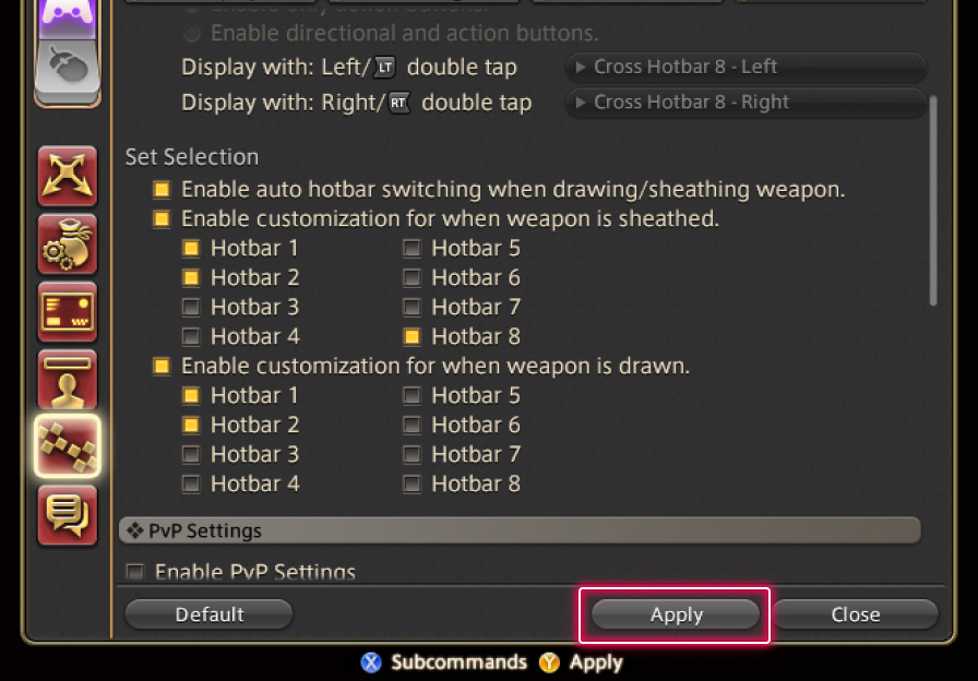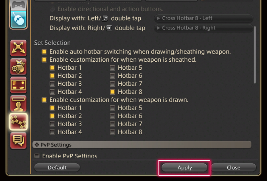 After selecting cross hotbar sets for when drawing/sheathing your weapon, press the Apply button and test out to see if it really works for you.
