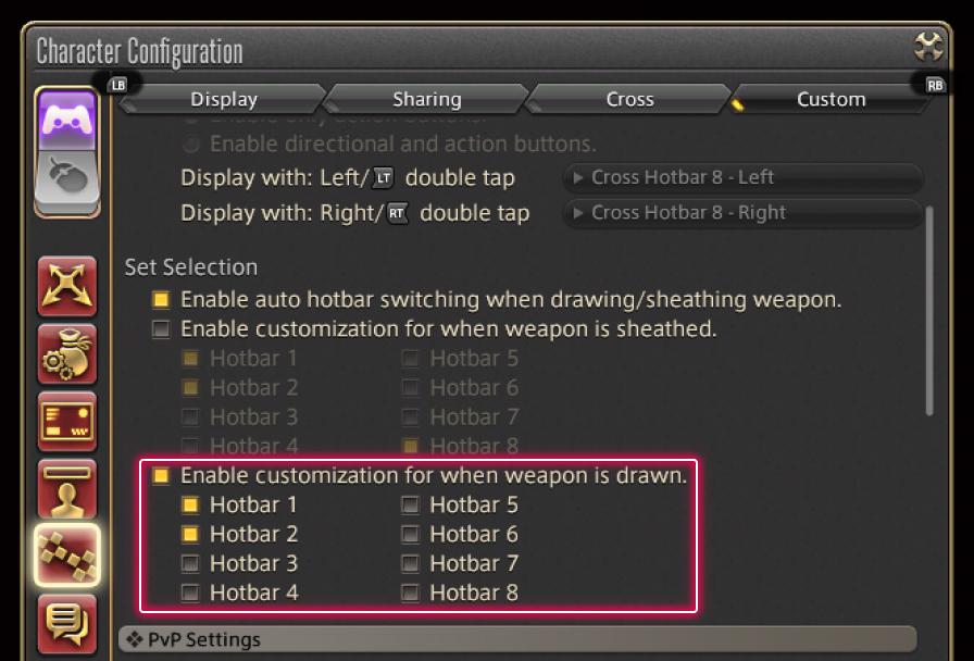 From the same menu, check the box labeled "Enable customization for when weapon is drawn." and then select cross hotbars you wish to include in the set used when your weapon is drawn.