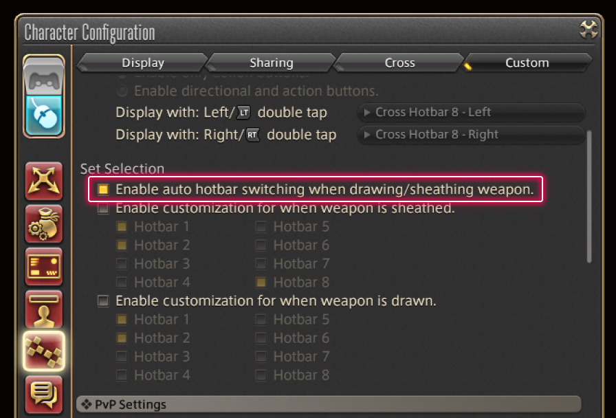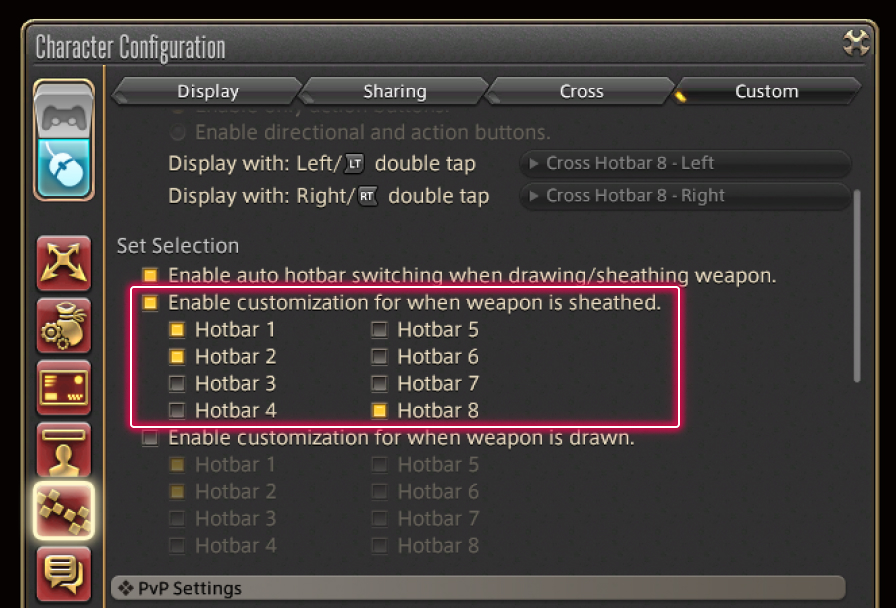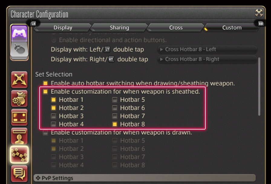 * If you want to keep using the current cross hotbar set when your weapon is sheathed, you can disregard this setting.
