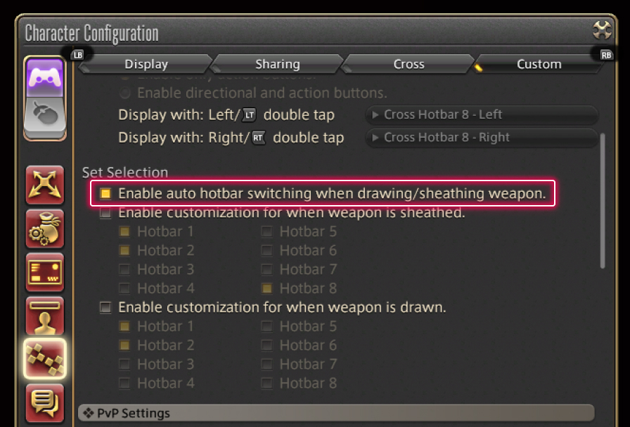 * If you want to keep using the current cross hotbar set when your weapon is drawn, you can disregard this setting.