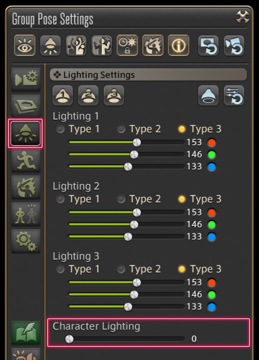 Use the slider under Character Lighting in the Lighting Settings tab to adjust lighting on character.