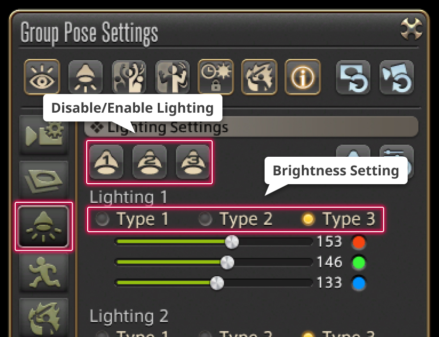 These lighting settings can be found under Lighting Settings in the Group Pose Settings menu.