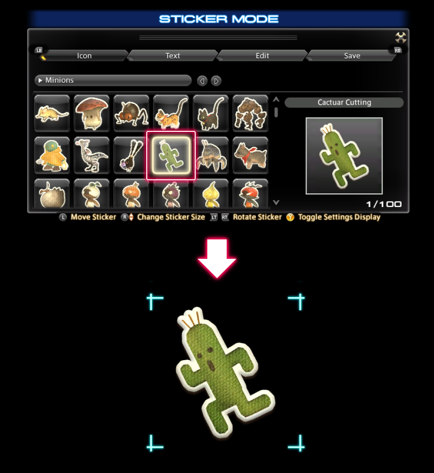 For minion, meal, decoration, or speech bubble stickers, select the Icon tab. For text stickers, select the Text tab.